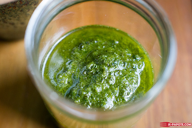 Le pesto nous vient du nord-ouest de l’Italie (région de Ligurie précisément). À base de basilic, pignons de pin, huile d’olive, d’ail et de parmesan râpé, c’est une sauce incontournable de la cuisine italienne. Les pâtes au pesto sont un plat gourmand incontournable chez nous, alors on s’est dit qu’une vrai sauce pesto fait maison, de nos petites mains, serait sûrement une bonne idée plutôt que d’utiliser des sauces toutes faites.