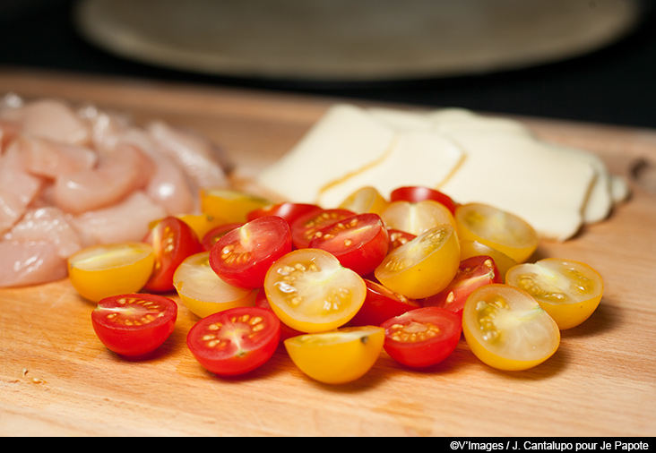 - Commencez par découper la mozzarella en tranches, le filet de poulet en morceaux, et les tomates cerises en deux.