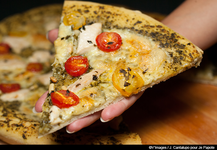 - Enfournez à 180°C sans préchauffage. Quand la pizza est presque cuite (le temps peut varier selon votre four), montez la température à 230°C pour les 2 dernières minutes, histoire d’obtenir une pâte bien dorée et légèrement croustillante.