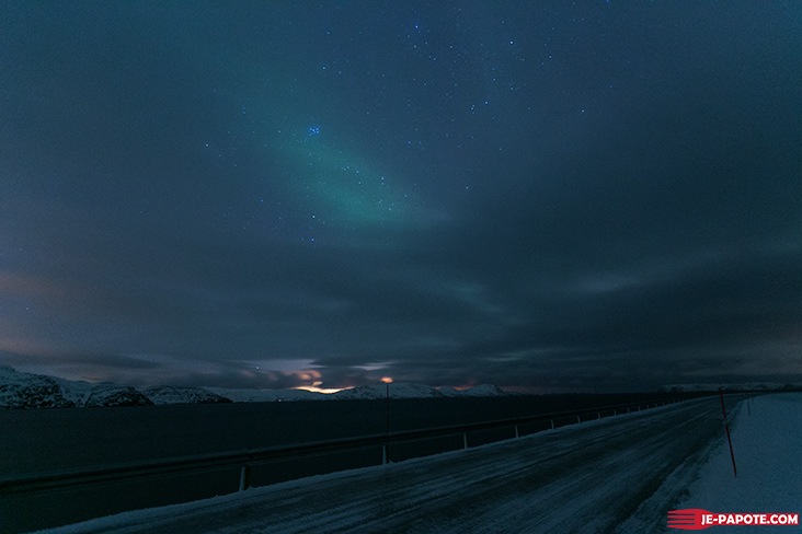 Nous roulerons beaucoup ce soir là, beaucoup trop (en direction du nord) pour trouver un bon spot avec point de vue vers le nord mais il est difficile de trouver le bon endroit pour s’arrêter et sans pollution lumineuse. En route, nous nous arrêtons pour voir ce qu’il se passe dans le ciel, et demoiselle Aurore est toujours là derrières les nuages !