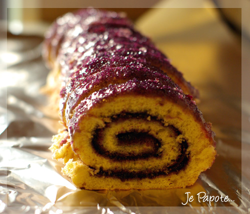 – Une fois refroidi, déroulez le biscuit et badigeonnez de crème au chocolat blanc puis de confiture de myrtille.